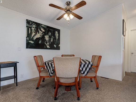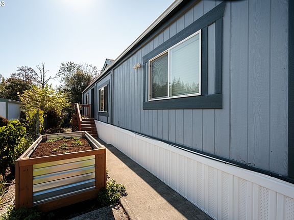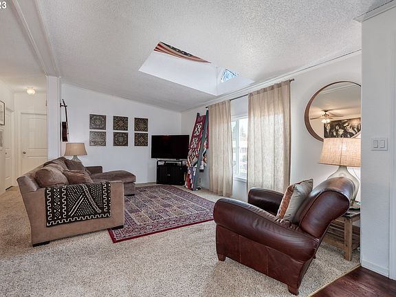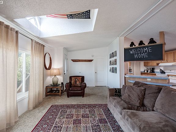 Well worth looking at this home! Nice and open floorplan. Eating bar and pantry in the kitchen give you space plus casual dining options along with your formal dining room area. Skylight offers natural light in the living room even on the rainy Oregon winter days. Primary bedroom located in the back of the home allows for great privacy. Adorable yard including raised garden beds, paver patio and thoughtfully designed, fenced yard. Single car garage plus driveway parking. All offers are subject to park approval of the buyer. Don't miss this opportunity for easy care living at an affordable price.