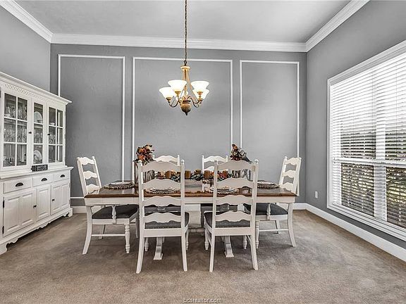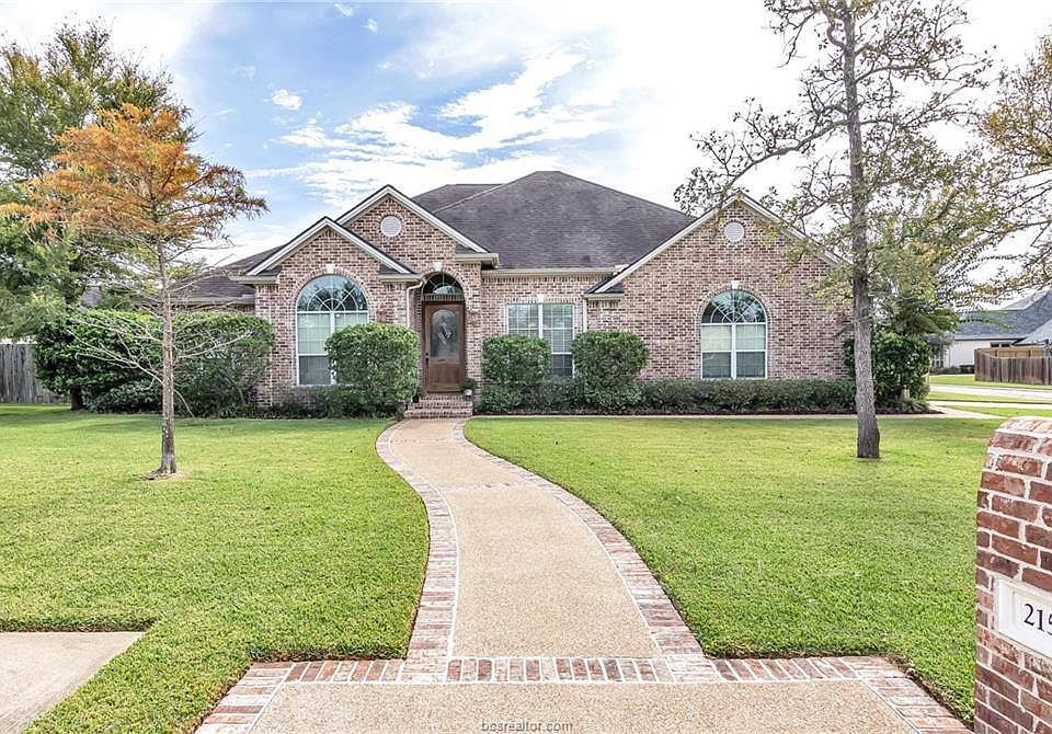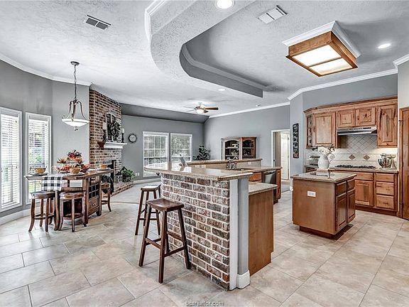 Holiday entertaining is just around the corner, and so is this gorgeous home in south College Station! You will be ready for those holiday traditions in this spacious dining with ornate trim and crown molding. For larger gatherings, there is plenty of additional seating in the light and bright breakfast area as well as at the beautiful, lengthy eating bar adorned with brick accents and granite counters. The open concept kitchen showcases walls of cabinetry, built in oven and microwave, gas cooktop, walk in pantry, and island. Rounded archways and crown molding accent the formal living area which has open views to all other living and dining spaces. Flanked by a beautiful brick fireplace, the family room is versatile as a second living space or even great for a pool table. At the end of the day, retreat to the privacy of the master bedroom with a huge en suite bathroom boasting separate shower, jetted tub, double sinks, and roomy walk in closet. This home features a three way bedroom split floor plan, and the second bedroom with its own wing, includes a full bathroom with walk in closet. Across the home are the third and fourth bedrooms along with a full sized hallway bathroom. Take your entertaining outdoors with the covered patio and lushly landscaped backyard.