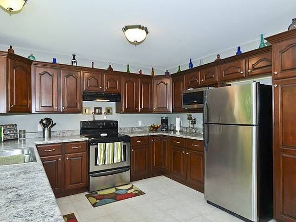 This meticulously maintained & beautifully updated 3bed, 2bath ranch radiates pride of ownership! Attractive curb appeal enhanced w/low maint ext. welcomes you inside this gorgeous home. The vaulted GR & cozy WB brick fp, with raised hearth adds to this stunning rm. GR has open stairwell to LL. The kitchen/ dining area remodeled '07, offers cherry cabinets w/crown atop, ceramic tile flr, stainless steel appliances. The breakfast rm opens to a large composite covered deck,aluminum spindles, ceiling fan, slate patio with cozy firepit, additional patio, fully fenced level yard that backs to woods! Elegant master w/ beautiful hrdwood 09,& lux master bath new in '09 w/cherry vanity, tub w/sep shower. Two additional bed rm w/ bamboo hardwood flrs. Other features: MFL with tile floor, sink, new landscaping 09, Huge W/O LL, 2 doors leading to outside for your convenience & rough in ready for your finishing touches. Two car oversized garage w/ openers adds to this beautiful home.