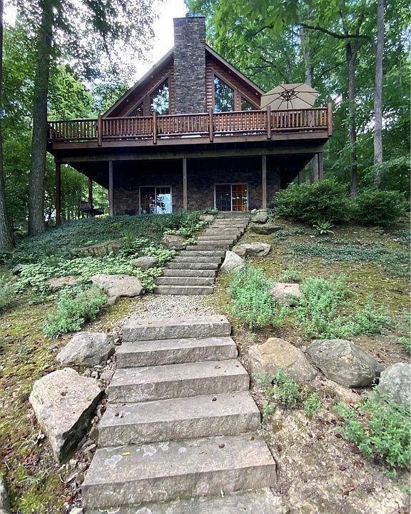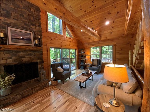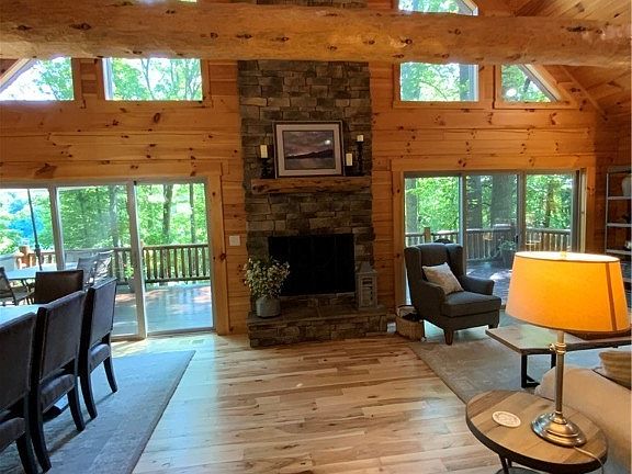 This lovely, warm & cozy log home was built in 2011 on a premium lakefront Lot w 135 feet of lakefront. An old home was knocked down & this home built based upon the desirability of this elite site. Home sits among the trees w a picturesque view of gorgeous Lake Buckhorn. The lot sits on the main lake but at a point where the shoreline circles in so that the boats are further out & you can comfortably enjoy water activities off your dock. This custom designed Log Home was built by Walnut Valley Log Homes. It has a two story Great Room featuring a stone fireplace which soars to the vaulted ceilings & dual triple sliders on each side of the fireplace leading out to the large deck among the trees overlooking the gorgeous lake views. There is a peaceful loft overlooking the Great Room. Brand New kitchen 2 years ago featuring Mullet Custom Cabinets, Quartz Counters [large island w induction cooktop w downdraft] THERMADOR Appliances [Double Oven/top is Speed Convection Oven/Microwave][Bosch