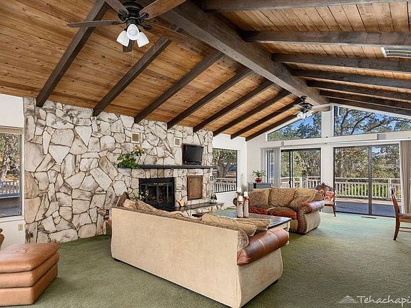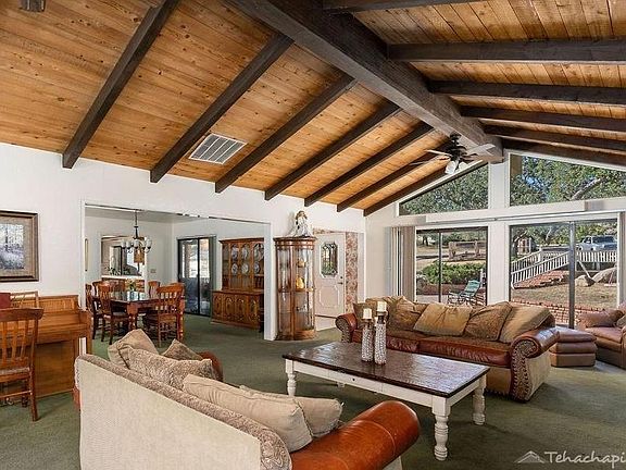 This spacious home is tucked away in the beautiful area of Golden Hills West surrounded by majestic oak trees, mountain views, and only minutes away from downtown Tehachapi. Featuring nearly 2,900 square feet of living space, this lovely home has a floorplan with a large open great room, natural wood vaulted ceiling, stone stacked fireplace, living room, dining room, 3 bedrooms, 4 full bathrooms, kitchen with plenty of storage, and a sizeable laundry room with a sink. There are numerous windows and sliding glass doors throughout this home letting in plenty of natural light and beautiful views. The second half of the home is permitted (per seller) with enough living space for visitors or possible renters. There is even a shop for hobbyists. That's not all! This home also comes with a charming, detached accessory building with a sleeping loft, small bathroom, unfinished kitchenette, and wood laminate flooring throughout. The exterior offers open spaces, a fenced garden area, tidy landscaping, covered patio with reclaimed red brick, spacious area with firepit, and counterspace with service window from the kitchen. The side patio has a pergola with stone tile. The back of the home has a wood deck to enjoy the starry nights in the Tehachapi mountains. This is the ultimate place for entertaining with lots of space for kids to run and play. This entire property has SO much to offer you must come and see for yourself! The seller is motivated!*Priced well below the recently appraised value of $720,000.
