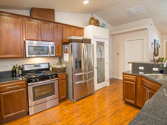 New in 2014 - 3/2 home, 1/2+ acre with natural gas & built-in fire sprinklers. Granite tile counter tops, stainless steel appliances, brushed nickel hardware & fixtures. Tile, carpet and laminate flooring. Master suite features a large walk in closet, & double sinks. On-demand water heater, full laundry room, lap siding, comp roof, covered front/back patio & RV parking. Built for energy efficiency