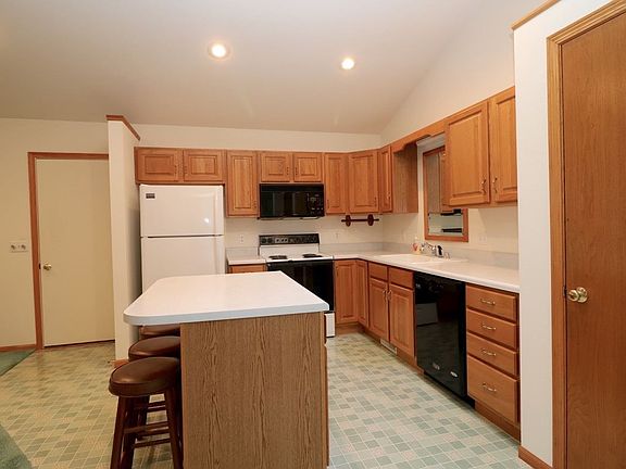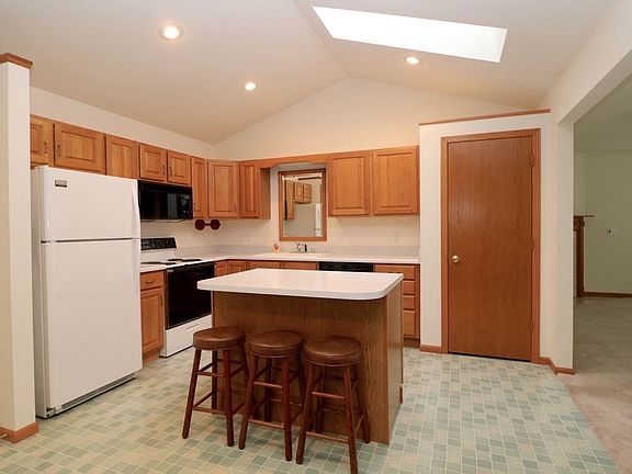 Ranch townhome on westend offers 2 bedrooms and 2 1/2 baths, eat-in kitchen, all appliances remain, living room and family room with gas fireplace on main floor. Open concept with vaulted ceilings and skylight. Main floor laundry. LL is finished w/family room and full bath. Lots of storage. 3-car garage with steps leading to lower level. HOA dues of $60. month cover lawn care & snow removal.