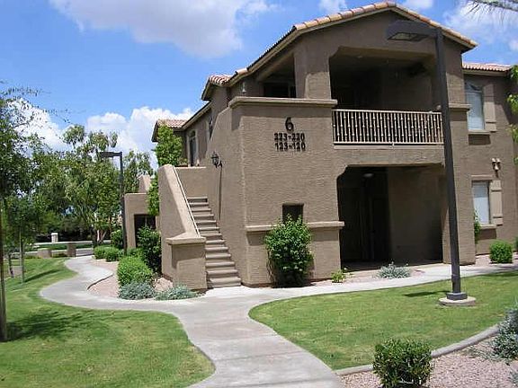 Brand new lovely model condo; never lived in. 9ft ceilings; 8 ft. exterior door. End unit on ground level w/pool view. Maple cabinets w/crown molding, stainless appliances, slab granite counters, upgraded lighting & fixtures, upgraded tile & carpet. Tiled & covered entrance patio w/fan. Fitness Room. Pool & Spa with BBQ, seating areas, & kids play area. Great location to shops, restaurants, 101 Loop,& schools. Your clients will have opportunity to be first to occupy this unit. Vacant for quick close. Unit is immaculate; your clients will love this condo and location.