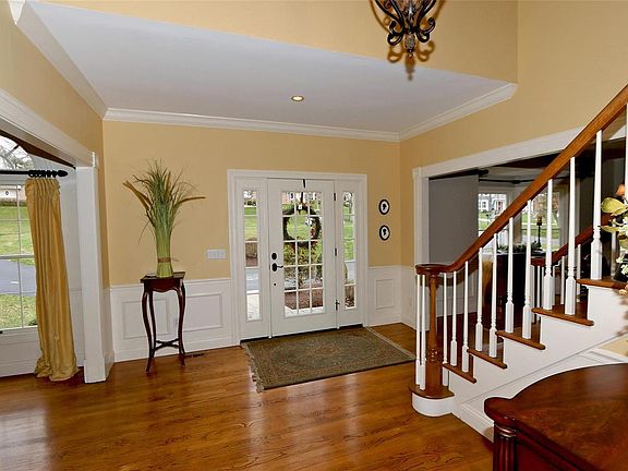 TASTEFULLY UPDATED 2-STORY ON 1 ACRE! STUNNING MILLWORK THROUGHOUT! BACKS TO WOODS! Enter off the circle drive & into the soaring 2-story open foyer w/T-staircase. Gleaming wood floors & 9' ceilings throughout the main level. Spacious dining room to the left, living room to the right, both w/palladian windows. French doors from living room into the handsome paneled den. Family room boasts a floor-to-ceiling gas fireplace, wet bar, & oversize bay window w/plantation shutters. Custom kitchen w/42" maple cabinets, center island w/breakfast bar, granite counters, stainless appliances, butlers pantry, & fabulous 8' long window above the undermount sink. Handy laundry room w/matching maple cabinets is adjacent. Atrium door off the breakfast area leads to covered deck that overlooks the level back yard & woods. 4 bedrooms upstairs: Master suite w/walk-in closet & exquisite private bath. 2 bedrooms share a Jack&Jill bath. 4th bedroom w/private bath. Walk-out basement. In-ground sprinklers.