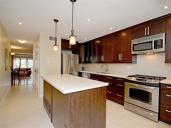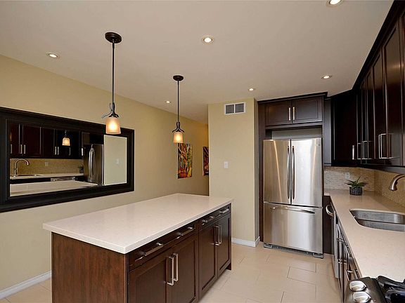 3 Bedroom Converted To 2 Bed By The Builder In Prime Miss Area Of Erin Mills, Featuring Newly Renovated Bathrooms, New Kitchen, Hardwood Flooring, Pot Lights On Main Floor. Offers A Modern Open Concept Kitchen With Quartz Counter Tops, Extra Large Quartz Kitchen Island, Ceramic Backsplash, And Modern Tile Flooring. Cozy Bsmt With Fireplace, Great For A Play Room Or Extra Living Space.