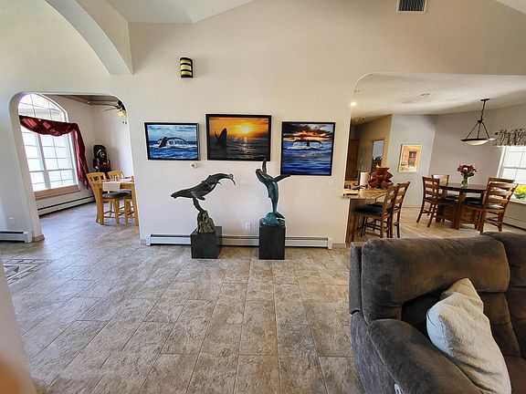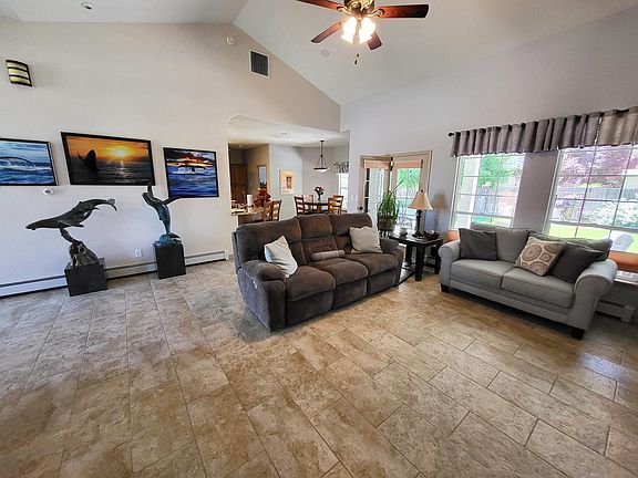 Ranch style, one step entrance. Covered patio with propane fire pit and hot tub with room for entertaining. Patio includes dining and cooking center. Beautifully landscaped with mature rose bushes and mature trees. Built vacuum system throughout whole house. Automatic sprinklers and drip system. Needs no supervision. Built in cherry colored office credenza cabinets. Home alarm with video alarm system and stereo speaker system throughout the house and patio with individual volume controls in each room. Gas fireplace in living area. Open kitchen concept. Spacious master bedroom includes large master bathroom. Spacious walk in tiled shower with two heads and bench, private toilet room, separate jacuzzi tub, dual sinks and an extremely large walk in closet. Master bedroom and master bathroom has heated tile flooring. Three car garage, RV parking with full hookups and 2 full size sheds giving abundant storage. Selling completely furnished except for a few to be named personal items.