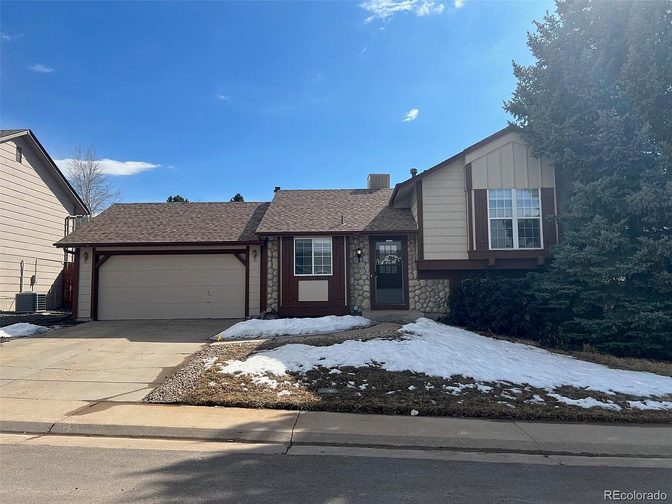 Move-in ready, 3 Bedroom, 2 Bath, Tri-Level in Parkborough. Main level has galley style kitchen with pass-through window to the dining/living room area with lots of natural light. The lower level has cozy family room with fireplace, bedroom, 3/4 bath and a laundry closet with the washer and dryer included. Upstairs has the primary bedroom, and additional bedroom. Primary bathroom is open to the primary bedroom and hallway for dual access. Large 16' x 12' wood deck with sunny exposure for year-round use in the private, and fully fenced backyard. Evaporative cooling system installed July 2018, 2 car attached garage. Park and open space within walking distance, and surrounded by trails! Close to shopping, dining, and easy access to E-470.
