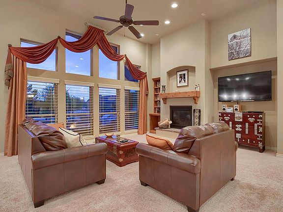 Great Room boasts a cozy gas log FP & built-ins, & is highlighted by dramatic picture windows, rising to soaring ceilings which deliver an abundance of natural light. Continue on to the gourmet kitchen which boasts a lg breakfast nook that walks out to a covered patio, where you can entertain w/outdoor speakers & rm for fire pit. Escape to the sophisticated walk-out master retreat featuring 10' ceilings, rm for seating, double sided gas log FP, spacious walk-in closets & luxurious 5pc master BA, w/ceramic tile flrs, his/hers vanities, lg garden tub & walk-in shower. One more spacious bdrm w/mtn views & full BA, are also located on the upper lvl. Finished basement which is an entertainer's dream, boasts a gas log FP, flex rm, theater area, wet bar & area w/pool table. The theater area w/projector system, surround sound & 110" screen, is complimented by a wet bar w/cherry cabinets, wine rack, bar fridge, & finished storage rm that could be converted into a wine cellar!