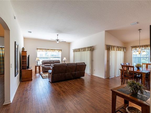 TURNKEY! SNEAK A PEAK GOLF & WATER VIEW! This 3 bedroom, 2 bathroom home is conveying turnkey, so all you will need to start enjoying The Villages lifestyle is a toothbrush. Picture yourself in the above ground spa spending time on your screened in birdcage with Sunbrella cover overlooking the golf view as the sun sets in the distance. It will feel like paradise! If you have ever desired to have a pool there is plenty of room on this pie shaped homesite. The kitchen features Oak cabinetry, kitchen island, and an abundance of counterspace. Gorgeous wood laminate flooring adorns the nook area, living room, and middle bedroom. The open floor plan is great if you like to talk to your guests while cooking in the kitchen. Volume ceilings make the home feel very open and lets in a lot of light. This home truly exemplifies pride in ownership. This is your chance to own a little slice of paradise! Won't you make this your Next Home?