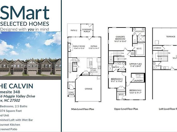This Calvin SMart Selected home features an impressive kitchen with an oversized island with plenty of room for the home chef and food enthusiast alike. The adjacent family room, dining room and outdoor screened in patio offer the perfect space for gatherings. The second floor features a large primary suite that is the perfect space to retreat to each night. You'll appreciate the large bedroom with bath and walk-in closet that gives you plenty of room for all your belongings. Two additional bedrooms, a full bath, flex space, and a laundry room are conveniently located down the hall. Head up to the 3rd level loft with a half bath and rooftop terrace, a quiet place to relax after a long day at work!