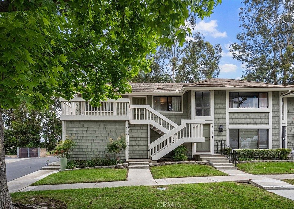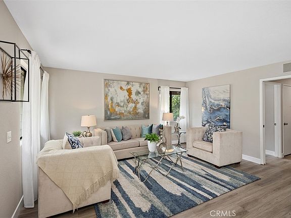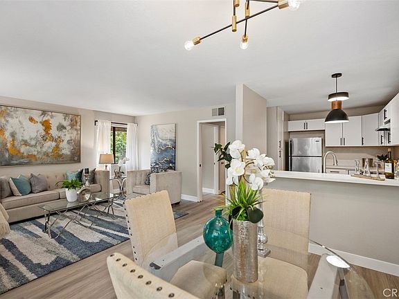 Fantastic private and quiet, end location! View of woods and trees! Completely upgraded. New decorator paint. New quality vinyl flooring thru out. New kitchen cabinets and quartz counter tops. New decorator lighting fixtures. Extended bar counter top. New stainless steel stove/oven and dishwasher. Stainless steel refrigerator (no warranty). Beautiful tree in front. End unit. No unit under or over. FHA and VA Approved Condo. Large open kitchen. Two bedrooms and one bath. Inside laundry. Attached garage. Beautiful Serrano Woods condo. View of trees and wooded area from upstairs bedroom windows. Enjoy the perks of living in Serrano Woods and the walking trails of Serrano Woods Park surrounded by mature Eucalyptus trees and flowing streams. Across from the Sun & Sail Club with elegant, large clubhouse, tennis courts, Pickleball courts, 34 acre lake, fishing, swimming pools, fitness center, numerous activities and holiday parties.. All the perks of a private country club! Located near walking trails of Serrano Creek Park with Eucalyptus trees and streams. Schools, shopping and restaurants close by.
