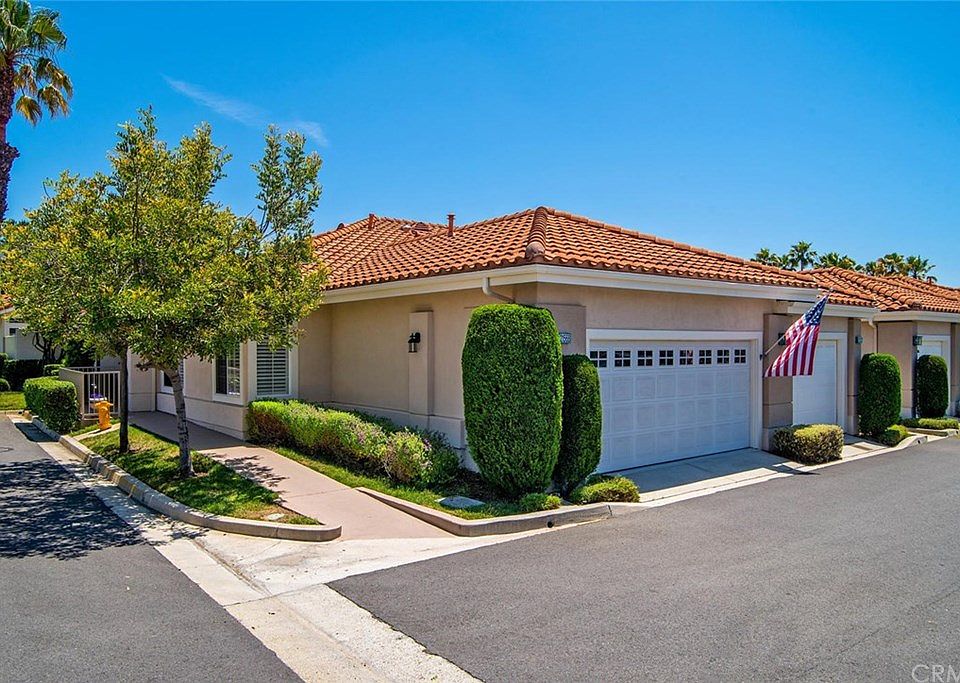 Updated Single level End unit in 55+ Palmia. This wonderfully located home features Two bedroom/Two Bath, Interior Laundry and a plethora of extras. Kitchen has been remodeled with beautiful Creamy White Cabinetry and Granite Counter tops. Quaint little nook for dining in addition to a Dining room if you so choose. Great Room with updated Fireplace and built in Cabinetry. Newer Vinyl floors, Over-sized base Molding, Plantation Shutters, Central Vacuum and Tankless Water heater. Remodeled baths include walk-in shower, and walk-in Tub. The charming and peaceful yard resembles an English garden complete with low hedges, foliage covering the parameter walls and brick & stone patio. The garage is also a haven with epoxy coated flooring, Built-in cabinetry and pull down attic for extra storage. This one is truly a delight and of course all the fabulous amenities of Palmia are available whether it be the fitness room, Tennis courts, Swimming Pools, 18 hole Putting green, Classes, Clubs, Trips and access to Mission Viejo Lake through Association membership. This one is a must see!