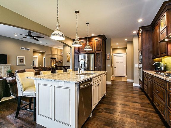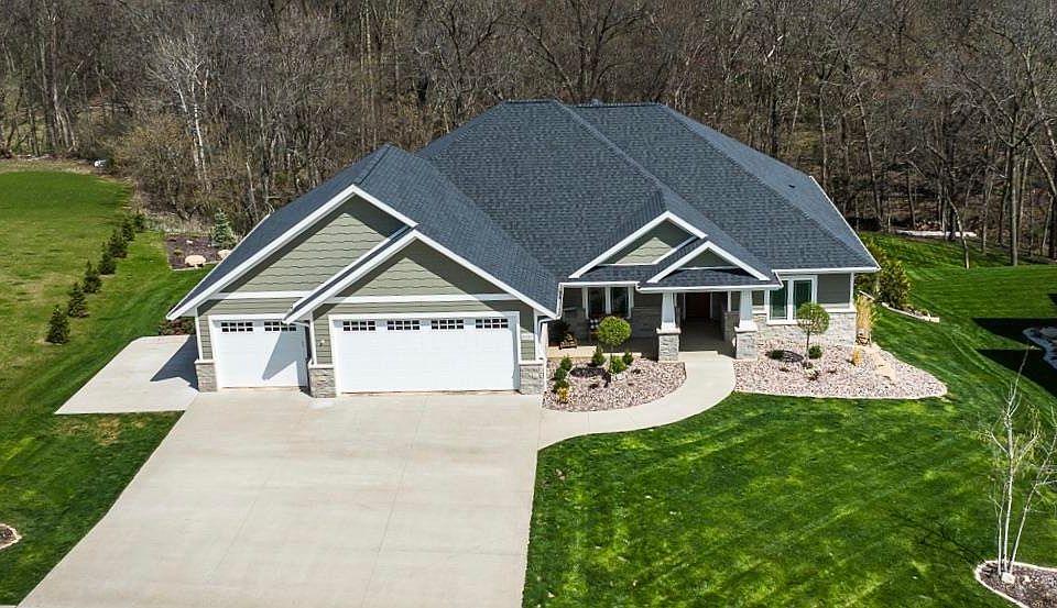 All the details and quality you would expect in this caliber of home. Built by PK Construction with flooring and cabinets by Smith Cabinet Works and granite by Imperial Stone. Great cul-de-sac location for this beautifully-kept walkout ranch home on 1.5+ acres in Timber-Hyrst Sub. 5 BR, 3.5 BA, 3 car & utility garage with workshop under. Incredible kitchen with grand, granite island. Eat-in kitchen with gorgeous walnut plank flooring. Master suite with everything you expect plus a stone FP. Lovely main floor office. Lower level is perfect for entertaining with a granite kitchenette and awesome rec space. You will love the outdoor living space; a covered deck and fantastic patio with limestone built-in fireplace. Spacious yard with beautiful landscaping and limestone accents. Small shed and additional getaway spot near the woods is the cherry on the top! This home checks all the boxes for luxury living with a cozy feel. Move right in and start living!