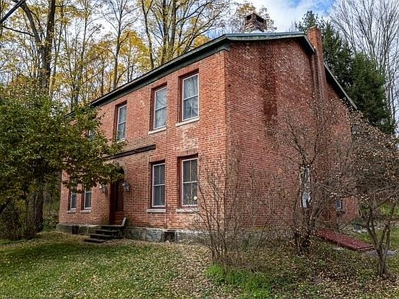 Old World Beauty meets New World Convenience in this historic brick colonial that has been meticulously renovated with painstaking attention to preserving the unique 19th century embellishments that were so thoughtfully handcrafted by it's original builder in 1812. The center hall opens to a wide staircase flanked on either side by a spacious dining room with decorative fireplace and a living room with a pellet stove. The kitchen is newly renovated with butcher block counter tops, ceramic tile floor and ample cabinet space. The primary bedroom is on the first floor and features double closets and an original fireplace with full wall of brick. A renovated bathroom and a laundry room finish off the first level. The second floor presents three more bedrooms, a family room or office space, a large bathroom and extra closet/linen space. The walk up attic offers plenty of storage space. The large basement features room enough for a work shop. There is a storage space and a one car garage space attached to the back of the house as well as a detached two car garage with a newer metal roof. There's also a chicken coop a metal canopy, a storage shed and a large post and beam barn (note: this barn is in need of repairs) With 5 acres you'll have plenty of room for gardens and recreation. Finel Hollow Brook borders the property on two sides making this the perfect place to relax and unwind. Close to Mountain biking/hiking trails. (not all fireplaces are in working order)
