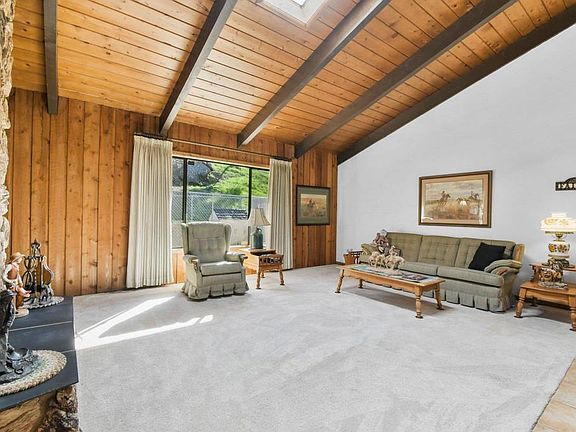 Great value for a single-level home in desirable Palo Verde Ranch. Offering 2,440 square feet of living space all on one level, plus direct access from the garage into the house. The spacious kitchen features abundant storage, a breakfast bar, and opens to the family room with a two-sided fireplace, currently equipped with a wood-burning stove insert. The dining area flows into the living room, showcasing vaulted open-beam ceilings and plush carpeting. The home offers four bedrooms and an updated hall bathroom with dual sinks and a tub. The primary suite is generously sized and includes a walk-in closet, dual sinks, shower stall, and a sliding glass door with direct access to the backyard pool and spa. Situated on two acres of land, the property features a charming pool and spa, a large barn with carport, a storage shed, and additional flat land behind the home. Located on a corner lot in Palo Verde Ranch, residents enjoy access to community amenities including Palo Verde Lake, clubhouse, playground, pickleball courts, volleyball courts, and more. A wonderful opportunity to enjoy space and privacy.