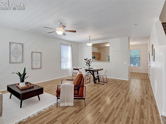 Beautiful end-unit townhome ready for you to call home with the perfect balance between privacy and low maintenance living! Conveniently located with easy access to military installations, schools, restaurants, shopping, hiking, entertainment, and a wonderful large park with beautiful views of Pikes Peak and Cheyenne Mountain. The main level features an open concept living room, dining area, half-bath and kitchen with large windows all around that let in a plenty of light to make the space feel bright and cheerful. The large kitchen offers generous cupboard and countertop space. All appliances are included as well as the washer and dryer which are conveniently located next to the kitchen. Upstairs, find a large master with a dedicated bathroom as well as two extra bedrooms and an additional full bathroom. The lovely covered front porch is a great area to enjoy those beautiful Colorado summer nights. Additionally, the kitchen has a back door with access to a grassy area to enjoy. Each unit has one designated parking spot right in front of the unit with plenty of open parking surrounding the unit for your guests or other vehicle owners in the home. Don't wait to schedule your appointment to come and see this charming townhome and make it your own!