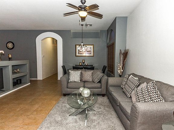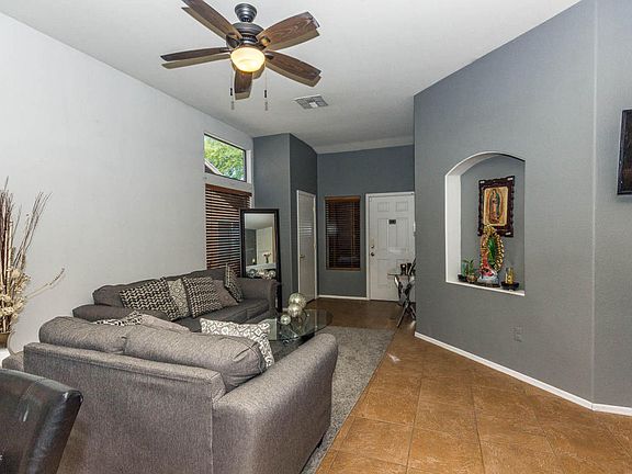 Exceptionally well kept home in Tres Pueblos subdivision. This home offers an open floor plan with vaulted ceilings, tile flooring through-out accept bedrooms, ceiling fans, security cameras, 2 car garage, and covered patio for relaxation. The subdivision also includes very nice park with playground area, basketball, and exercise path. Existing gas stove will be replaced with electric black stove and all tv's will be removed as well. Dog in back yard. Beware!!! Seller will not be making any repairs, property sold in as-is condition.