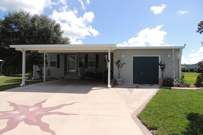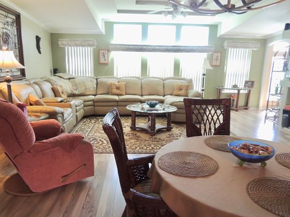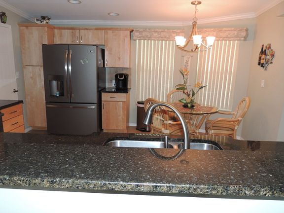 The home is a Palm Harbor Wellington model, Timberline Deluxe Series. This 3/2 plus den home is worth EVERY penny! It boasts new cabinets w/self closing drawers and pull outs, granite countertops, laminate and tile floors, double pane windows. 12 X 16 deck overlooking the spacious back yard with conservation view. New slate appliances & water softener 2015. New A/C 2016. Monthly lot rent is $778. HOA is $15/year.
