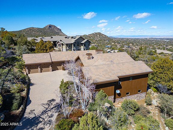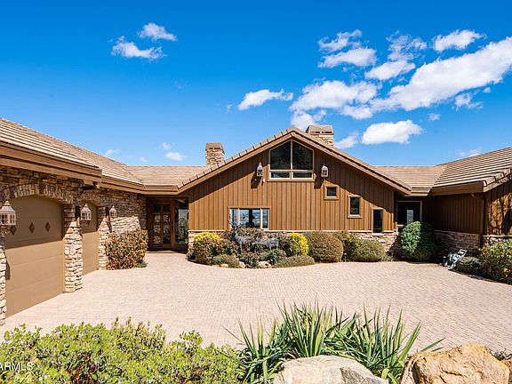 Nestled within the prestigious Hassayampa Village, this magnificent contemporary mountain home offers the epitome of luxury living. Situated behind the main gate and positioned near the pinnacle of the community, the residence boasts breathtaking, expansive vistas that encompass the majestic San Francisco Peaks, the iconic Thumb Butte, the sprawling National Forest, and the charming downtown Prescott. Designed for seamless and sophisticated living, the main level is a testament to both elegance and functionality. The gourmet kitchen is a culinary enthusiast's dream, while the great room, with its soaring stone fireplace, paneled walls, and tongue and groove ceilings, exudes warmth and grandeur. A well-appointed wet bar, complete with a refrigerator and ice machine, caters to effortless entertaining. The oversized master suite is a private sanctuary, featuring "His & Her" walk-in custom closets, ensuring ample space and organization. Two additional ensuite bedrooms and two offices on this level provide versatility and convenience.