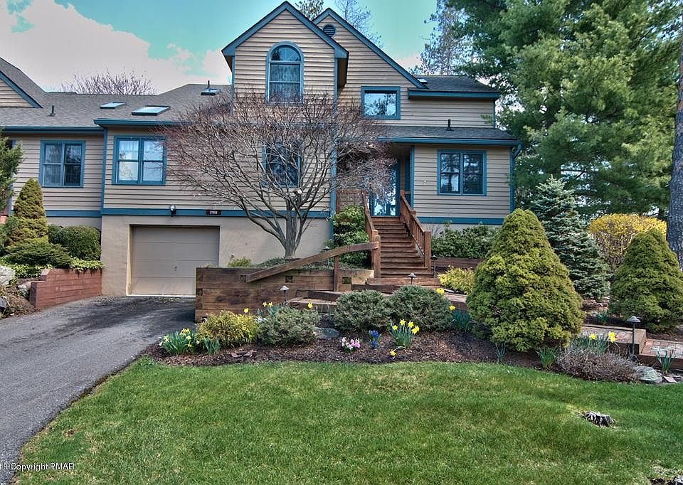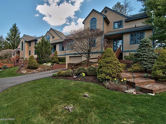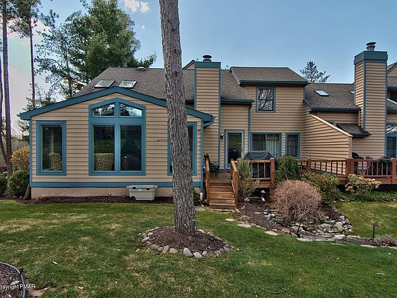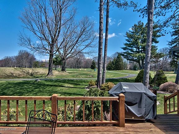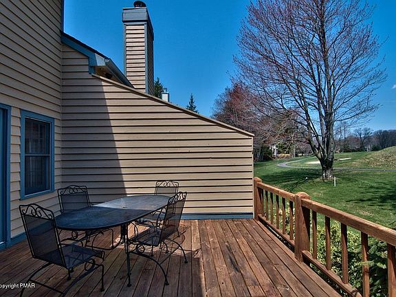 Gorgeous end-unit townhouse fronting the 4th Green of the beautiful Buck Hill Falls White course. Priced to Sell! This is one of the largest townhouses on the golf course with 4 bedrooms and 3 Full plus one half bath. This open floor plan home features living room with vaulted ceilings and wood-burning stone fireplace, large sunroom, remodeled kitchen, den, laundry room and hardwood floors. The master suite is on the first floor with large bath, walk-in closet and deck. Upstairs are 3 bedrooms and 2 baths. This spacious home also has a finished basement with large play/family room and extra room for storage/office. There is an oversized one-car garage large enough to also hold a golf cart. Sold furnished. The panoramic views of the golf course are stunning. Call today to view.