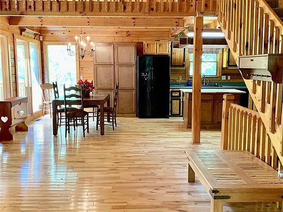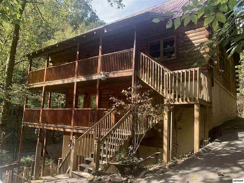 With a little TLC this CABIN ON THE CREEK will be a showplace! The main level features an open floorplan, wood beamed cathedral ceiling, and large windows & glass doors opening to one of the covered decks overlooking the creek and gazebo below. The living area features a stone fireplace with gas logs. The kitchen is enhanced with a custom wooden pot rack above the island and large dining area. The master bedroom on this level has an adjoining bath with a custom tiled walk-in shower. The upstairs features a bedroom, full bath and a catwalk to the private covered deck overlooking the peaceful creek/gazebo. On the lower level there is a recreation room large enough for the pool table and den, full bath with custom walk-in tiled shower and stone vessel sink. The third bedroom is on this level, along with an additional large room that has the washer/dryer closet in it. The fabulous location will make this a great rental property with it's convenience to the Smoky Mountains, Gatlinburg, & Pigeon Forge.