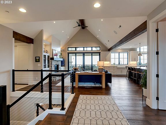 This stunning modern farmhouse sits on 4.84 acres of picturesque land and offers breathtaking vineyard, valley and Mt Hood views. Crafted with high-quality materials, this home boasts luxurious features from the open concept family, kitchen, dining, bonus and outdoor areas making this home perfect for entertaining. The chef's kitchen has a large slab island, Meile beverage maker, and top of the line appliances. Toast to the incredible temperature-controlled wine room with 500+ bottle storage that rounds out this impressive space. The covered outdoor living space has an outdoor fireplace and endless views, a perfect place to cuddle up and enjoy a relaxing glass of wine. The main level also features the primary bedroom with an ensuite bathroom that has a walk-in tile shower, soaking tub, and dreamy walk-in closet. Also on the main are two additional bedrooms, one with a private bathroom, and the other currently used as an office. Downstairs has a large bonus room offering endless possibilities and boasts a full bedroom suite, private patio access and lends itself to multigenerational living. Other features include a custom standalone sauna, a large enclosed French garden, an oversize 3 car garage with extra deep middle bay for ample boat storage, gated driveway access, and more! This is a rare opportunity to own a truly exceptional property that offers luxury, comfort and a prime close-in location for easy access to area conveniences and excellent Sherwood schools!