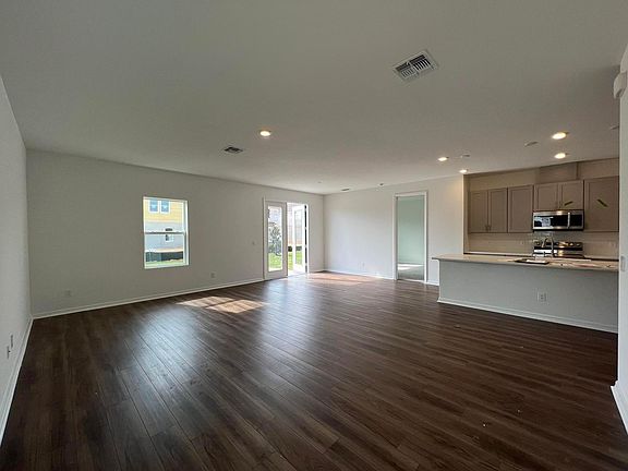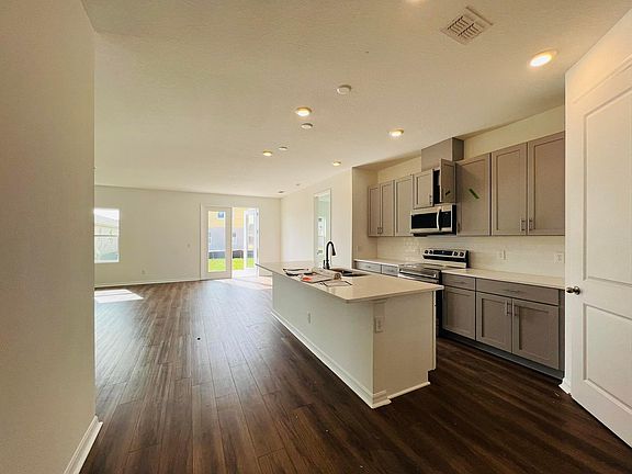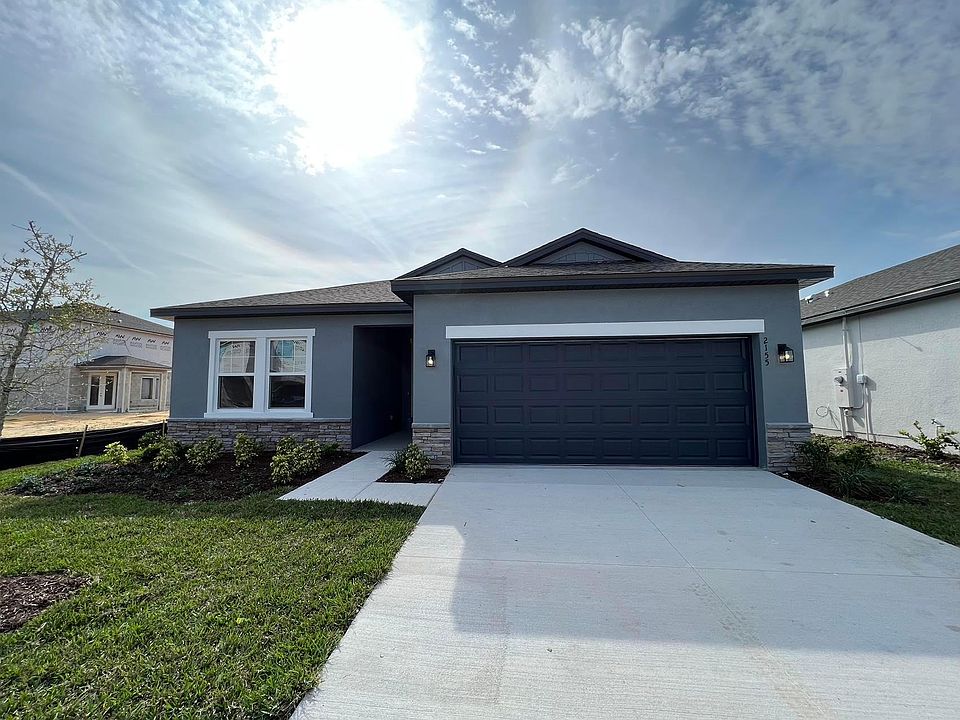 Welcome to The Glen at West Haven! Gorgeous brand new home located in the highly desirable Champions Gate area. This beautiful one story home with no rear neighbors has a sunny bright, open kitchen with plenty of upgrades such as beautiful 42 inch gray cabinets, all stainless steel appliances including range, dishwasher, and microwave. Enormous island with Quartz counter-top perfect for gatherings that is open to the great room and dining area. Main living space features wood look ceramic plank tile flooring and bedrooms with upgraded stain resistant carpet for comfort. Enjoy the amenities with a swim in the community pool, fitness center, tennis courts, playground and beach volleyball court. This home is conveniently located to shopping, grocery stores, Posner Park, Champions Gate Village and Walt Disney World. ( WASHER, DRYER AND REFRIGERATOR INCLUDED).