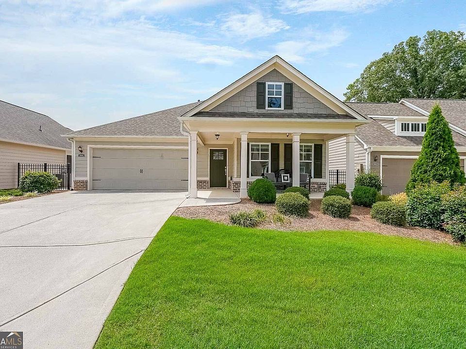 UPGRADES GALORE! Lovely 2 Bedroom, 2 Bath plus office floorplan. An active 55+Adult Community. Hardwood flooring thru out. Oversized family room was extended during the building process and boast a fireplace, wall of windows, built-in bookcases, all in an open concept floorplan. The large dining space is welcoming to family dinners or large parties. The kitchen is the heart of this home with upgraded cabinets w/storage extras inside including lazy susan, pull out shelving and more. White Cabinets, Double ovens, Granite Counters, SS appliances and large island. The split bedroom plan provides privacy for guests and Primary suite. The owner's suite features loads of light with large windows, oversized closet, double vanities, step-in shower with bench and sky light in bath as well. The office flex room is located off the hall way as well as the 2nd bedroom. Those two rooms share a full bath. The laundry room in this home is located just off the master and is large w/folding counter and cabinets. Don't miss the large walk up attic unfinished space for storage. The side yard is fenced and is accessed thru a lovely covered porch area. The community features a dog park, walking trails and community garden. Located in great West Cobb Location.