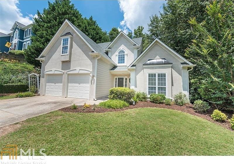 Rare master-on-the-main home in West Cobb swim/tennis community. Open plan w/high ceilings and renovated kitchen w/custom cabinets, Carrera marble backsplash, and granite countertops. Cozy master suite features trey ceiling, crown molding, dual vanities, garden tub, and walk-in closet. Three additional bedrooms are upstairs with secondary bath. Private backyard is a nature-lover's paradise w/pergola and large deck adjacent to a wooded stream under a canopy of trees. New interior/exterior paint and carpet make this home move-in ready.