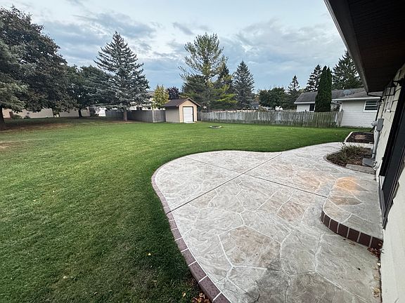 -Expansive backyard with a stamped concrete patio and a large storage shed perfect for fall evenings around the fire