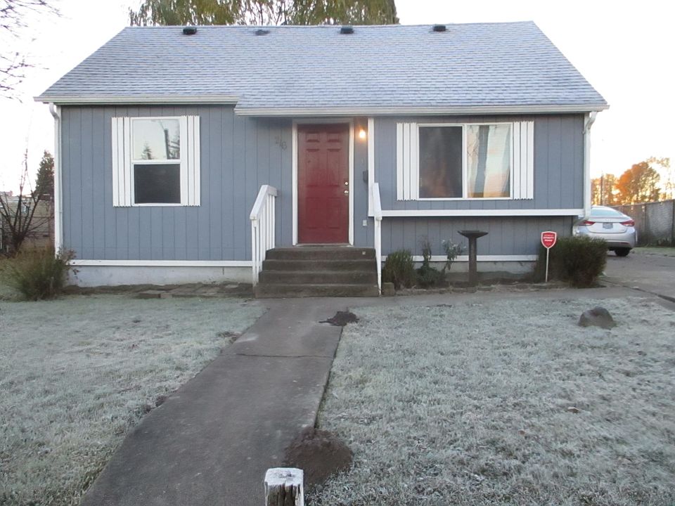 3 bedroom 1 bath home with large fenced yard located at the end of a dead end street. New vinyl in bathroom. Small area for table. Range, fridge, dishwasher and laundry hook-ups. Off-street parking. Garage included AS-IS No improvements to garage will be made. Only 1 (one) dog will be allowed!!