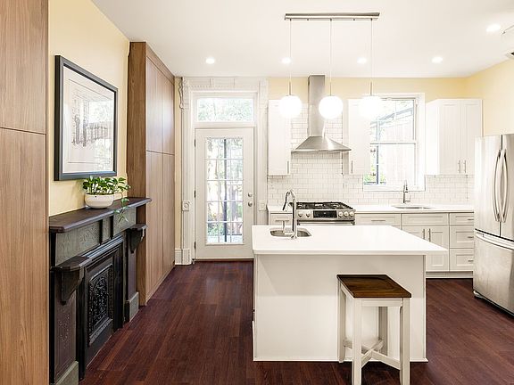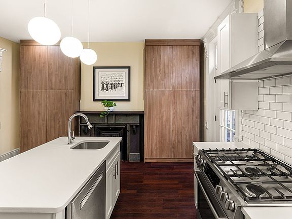 Via original stairs from the parlor floor or through its own private, street-level front entrance, the garden floor has new hardwood flooring and is presently configured as two rooms with a full bathroom in between, a kitchen, as well as direct access to the garden with a picturesque tree.