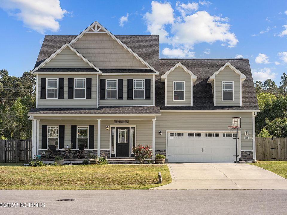 Location, location, location! Welcome to Bridgeport - only minutes to North Carolina's beautiful beaches and minutes to the side gate of Camp Lejeune. On hot days, take advantage of the community pool, picnic areas or neighborhood playground. The exterior of the home features beautiful stonework, carriage style doors and cedar shake accents. The fully fenced in backyard with patio is perfect for grilling, privacy and pets. Inside you'll find hardwood floor style ceramic tile throughout the downstairs. The fireplace is the focal point of the living room, which opens into the formal dining room. The spacious and sunny kitchen boasts stainless appliances, a kitchen island and an oversized pantry. A half bath is conveniently tucked around the corner near the garage door entrance. Upstairs, the master suite has two walk in closets and a tray ceiling. The large en suite bathroom includes a walk in shower, his and her sinks and a soaking tub. The upstairs laundry room with custom shelving makes doing laundry a breeze! Also upstairs are three additional bedrooms, one which is large enough to double as a bonus room/ flex space. New carpeting, fresh paint and custom blinds make this home move in ready!