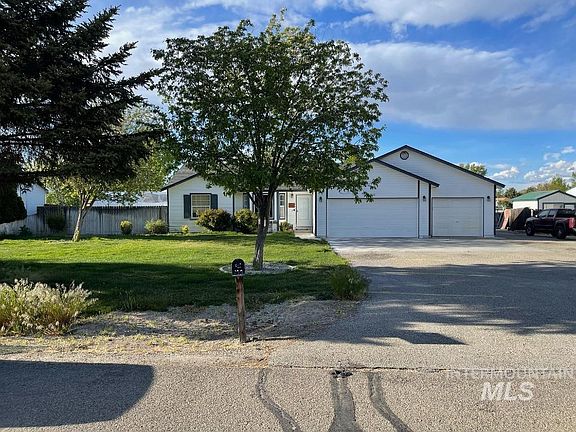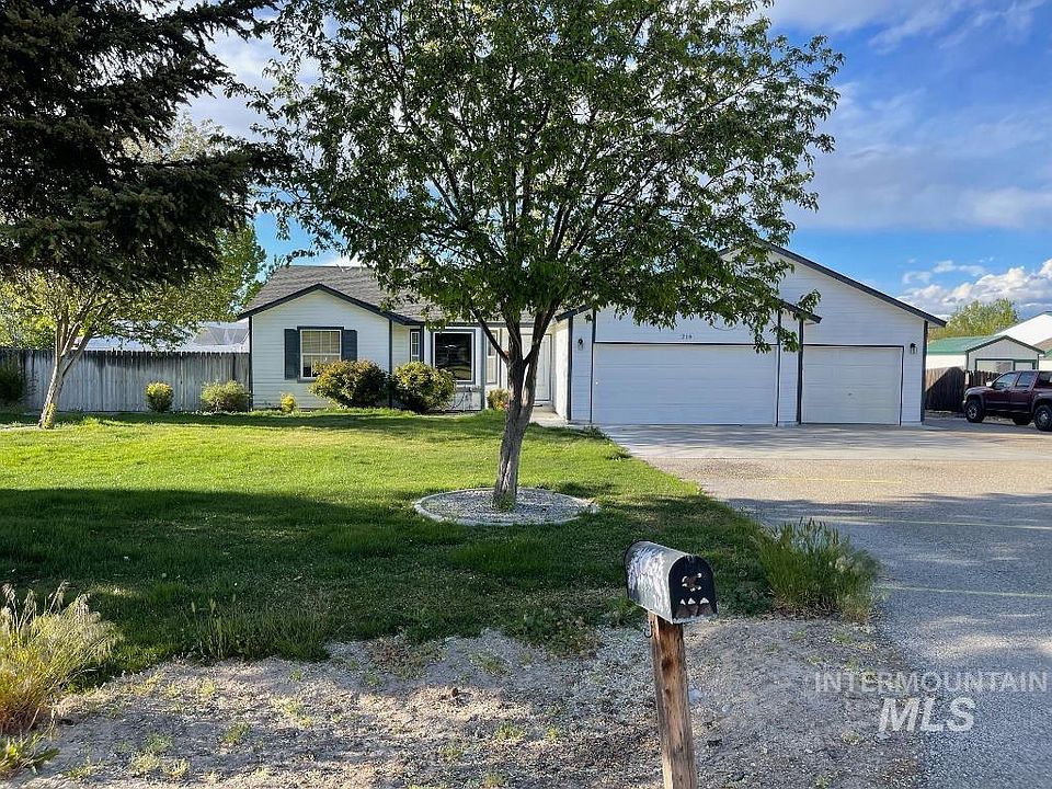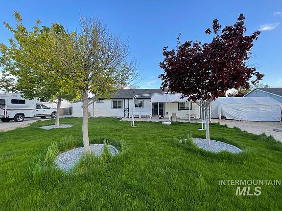 This single-level home is on a full 1/2 acre! The home is approx. 1,400 sqft with a three-car garage and three covered sheds, each on a cement pad, and a covered work area in the back. There is lots of room for tools and hobbies. There is enough parking in the front and the back to host large events - room to park more than a dozen vehicles! Plenty of room for recreational vehicles, RVs, etc. This home has shares a private well with a neighbor so there are no city water charges. The primary bedroom has a full private bathroom and a walk-in closet. The other two bedrooms share close access to a full bathroom. There is new luxury vinyl plank flooring throughout the home and it recently received a new roof. All systems are working well (heat, A/C, appliances, etc.). The newer washer and dryer are included, along with the other appliances in the home (refrigerator, microwave, dishwasher, water softener).