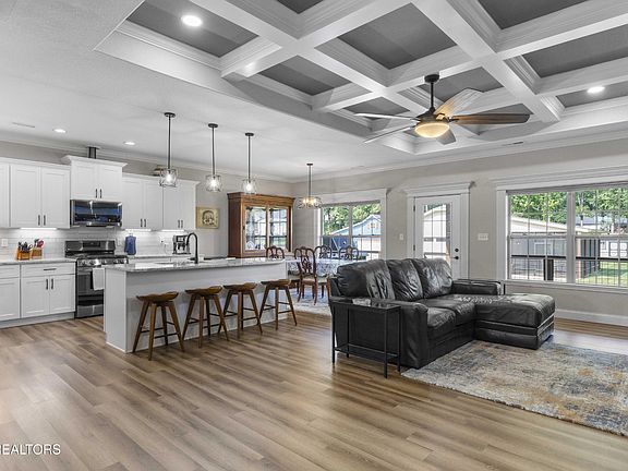 Inside, the spacious open concept layout features seamless flow between the living, dining, and kitchen areas ideal for everyday living and entertaining guests. Elegant crown molding, coffered ceilings, large windows that bathe the space in natural light, and classic fixtures add a touch of timeless charm throughout. The kitchen is a chef's dream, complete with a gas stove, granite countertops, stainless steel appliances, under-cabinet lighting, and ample storage.