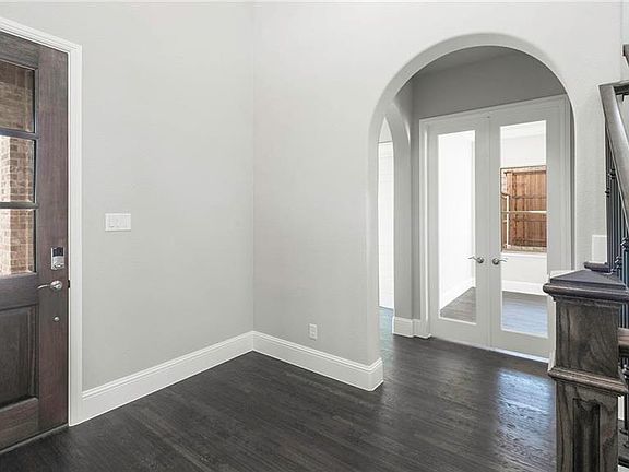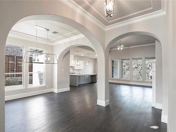 Study with French doors. Extended entry leads to formal dining room. Family room features a fireplace and a wall of windows. Kitchen with hardwood floor features an island with built-in seating space and a walk-in pantry. Morning area with a wall of windows. Private master suite. Double door entry to the master bath with garden tub, separate glass-enclosed shower, and a walk-in closet. Upstairs game room. Extended covered backyard patio. Three-car garage. This home backs to a wooded area!