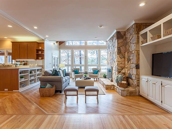 Working from home? Why not refresh & renew while you do? This 80's contemporary sits on a lake where sunsets can be enjoyed from almost every room, incl. the lg screen porch & sunroom. The enormous kitchen is open to the great room featuring vaulted ceilings, stone fireplace, and built-ins. Hrdwds added to 2nd flr halll, reno'd main bath, finished bonus space on lower level features wet bar, 1/2 bath, theatre room & new patio doors. 13 min. to Duke, 7 min. to Eno Park, 3 min. to Umstead Pines Golf Course.