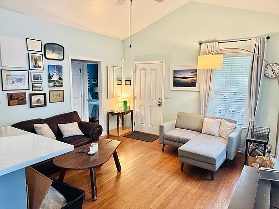 This charming bungalow is for rent on one of downtown's coolest little streets. Live on a quiet residential street, close enough to walk or bike to parks, nightlife and festivals, without traffic outside your front door. Built in 2009, closet space and floor plan are modern, with low maintenance yard and a front porch for sitting and chatting with the neighbors. Kitchen has new (less than 2 years old) stainless appliances. Windows have 2" faux wood cordless blinds throughout and alarm system is included. Two bathrooms gives a little space for privacy, and the pantry, coat closet and attached shed out back provide extra storage space. Off street parking accommodates two vehicles. Available March 15th. Pets are negotiable. Yard is fenced. Utilities are not included. Please text for tour or rental application.
