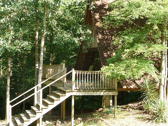 The Great Escape! A very affordable river front cabin on the Little Tallapoosa River of Lake Wedowee. RECENTLY REDUCED To $89,000. The water front features a concrete boat ramp, a stationary wood dock that extends into the river, and a great view in both directions of the river. The a-frame cabin is approximately 700 sq ft according to tax records. The downstairs has a living room overlooking the river and full size kitchen and a large bath that includes a step in shower stall. Upstairs is a large sleeping loft/attic. There is a window AC unit upstairs and downstairs. The property is fully