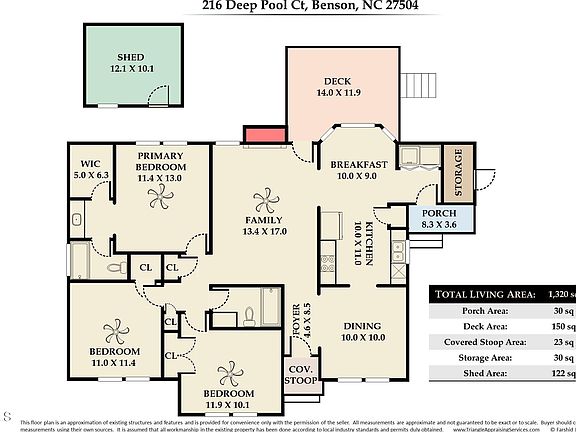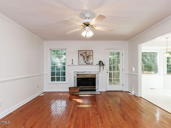 Located in Creekstone, this 3-bedroom, 2-bath home offers comfortable one-level living on a private 0.75-acre cul-de-sac lot. Fresh paint, new carpet, and hardwood floors create a move-in ready feel, while a gas fireplace, separate dining room, and bay-window breakfast nook add charm. The kitchen, with window views and included refrigerator, offers ample storage and potential for your personal touch. A vaulted ceiling enhances the front bedroom, while the primary suite overlooks the backyard with mature trees, garden space, and two fig trees. A rear deck and detached shed/workshop extend the living outdoors. With no city taxes, no HOA, & a great price, this home delivers both value & flexibility—plus walkable streets & an easy 30-minute drive to downtown Raleigh.