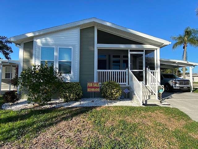 OASIS is the word that comes to mind when walking into this 1500+ sq ft home with a water view in the popular 55+ community of Colony Cove. This 2017 Palm Harbor (previous model home Casa Marina) is located on what feels like a peninsula with a private oasis! This fabulous home offers an open concept with a large kitchen island, open floor plan, spacious bedrooms, double sinks in master bathroom, and a deck off the Master bedroom! It is an open concept with gorgeous finishes. It has a beautiful kitchen with a large island...perfect for the aspiring chef or just entertaining with friends. The large spacious master bedroom is located on its own end of the home with an en-suite bath, dual sinks, and a walk-in closet. Wake up with a water view and have your coffee on the deck that only steps away. Just off the master suite is a nice-sized laundry room complete with a washer and dryer. The guest wing has two large bedrooms (or den/office), each with its own large closet and a guest bath nearby. There is ample storage in the yard sheds with an outdoor refrigerator, cabinets, and shelving. The front of the home is graced with a screened-in porch for relaxing in the evening and socializing with the neighborhood. This home has been meticulously maintained with only the best of everything. Walking distance to one of the Colony Cove pools and activity hall. The lot rent is $1,025 and includes water, lawn care, sewer and trash, and all the amenities of the park. Colony Cove is a 55+ community with 5 clubhouses, 5 pools, a fitness room, library, game room, billiard room, pavilion, and shuffleboard courts. Pet friendly offers a large dog park with views of the Manatee River. In addition, this park also has a private boat dock with fishing along with a marina with Gulf access. Close to restaurants and shopping areas making it convenient for seasonal and full-time residents. Please do not miss this opportunity, this could be your dream home! All listing information is deemed reliable but not guaranteed and should be independently verified through personal inspection by appropriate professionals. Integrity Mobile Home Sales cannot guarantee or warrant the accuracy of this information, measurements or condition of any property. Measurements are approximate. Lot rent subject to change.