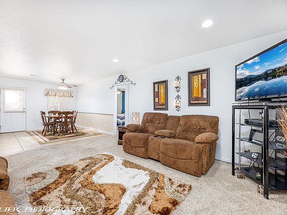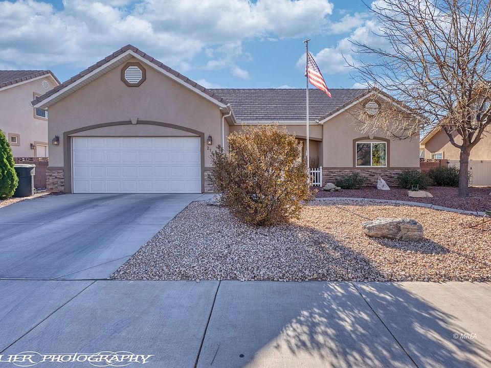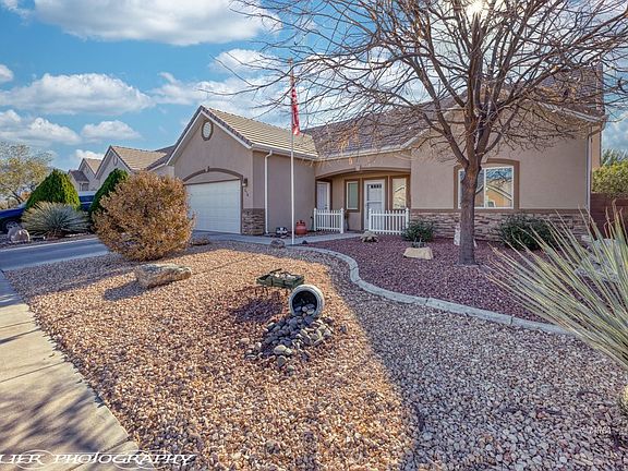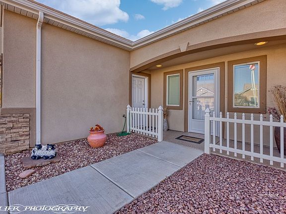 This spacious home is located in a highly desirable neighborhood south of I-15 with NO HOA's!! The home has mountain views and is fully fenced. The master bedroom is on the main floor with an ensuite bathroom and a walk-in closet. 2 guest bedrooms separated by a full bath are conveniently located at the opposite end of the main floor and can be closed off from the main living space with a pocket door. The kitchen has beautiful knotty alder cabinets and a tile backsplash. With 2 large bedrooms upstairs and the plumbing ready for a 3rd bathroom the space is prefect for all your needs. The back yard has desert landscaping and a covered patio to enjoy the beautiful weather and unobstructed mountain views. Upgraded epoxy coating on garage floor, front courtyard and back patio.