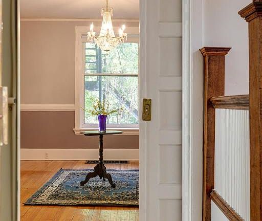 Only rarely does a Cornell Heights home of such graciousness, just five minutes on foot (across the pedestrian suspension bridge) from Cornell's Arts Quad, come on the market. Inspired by the Queen Anne style, this elegant home is one of the most distinquished structures in the Cornell Hgts  Historic District, founded in 1898 as a residence park for Cornell faculty .  On the wrap around porch  you can hear Fall Creek & the ringing of the Cornell Chimes . Walk through the terra cotta-tiled double entry,  & you'll love the hardwood floors, high ceilings,  curved  staircase, stained glass accents and a working prewar elevator . The spacious living room, with large windows is equipped with a wood stove. French doors to the library. Formal DR  with views of the back garden.Updated eat-in kitchen. Convenient main level full bath. Upper level has 4 BRs&2 baths. Partly finished walk-out bsmt has a laundry & full bath. Concrete drive,1 car gar,& great backyard with deck.