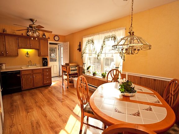 Marvelous 3/1.5 Ranch on HUGE, wooded lot! Living room boasts picture window, gas fireplace and beautiful laminate flooring overflowing into the open, full eat-in kitchen boasting plenty of cabinet space, loads of natural light, wainscoting with chair rail and door to laundry room with outside access to the large deck overlooking the enormous, fenced back yard. 3 spacious bedrooms and 1 full (remodeled in 2013) and one half bath complete this charming house. Outside find fabulous landscaping, beach shower room with hot & cold water, plenty of privacy, 2 outbuildings, and off-street parking for 3-4 cars. Roof only 6-7 years old, 2x6 frame full insulation, 16 insulation in attic. Heated attached 1 car garage with storage above. 2 year old vinyl, insulated windows. Washer, dryer, freezer and microwave all included.
