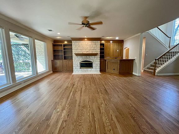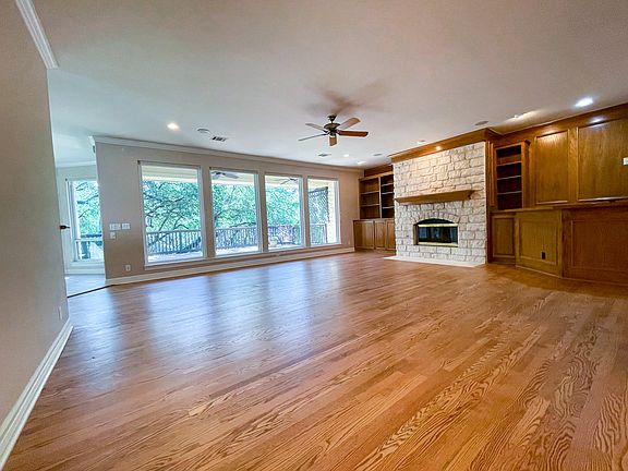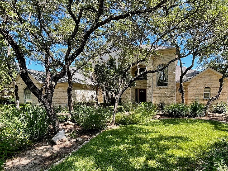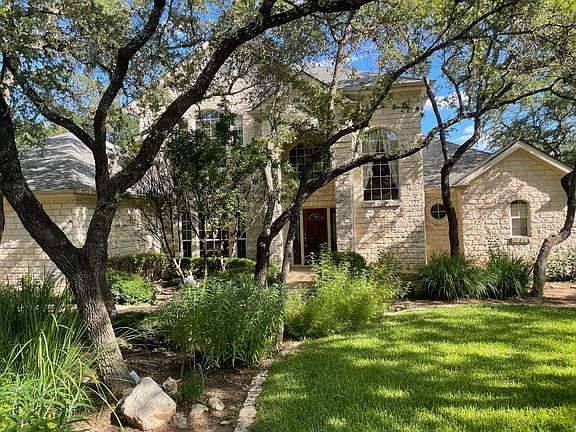 Nestled amidst beautiful oak trees lies the ultimate tree house! All primary and secondary rooms of this superbly designed, amazing custom home look out onto canopies of beautiful, mature trees peeking into the windows... bringing the outside in. An abundance of natural light bathes this beauty throughout the entire home. Upon entering the inviting and striking property, one's eyes are drawn to the wall of windows leading the eyes to appreciate the kaleidoscope of trees surrounding the large Trex deck and beyond. The huge, open living area offers a sea of custom cabinetry, bookshelves, and dry bar prepped for entertaining. The kitchen's strategic design offers massive storage and includes an appliance garage, granite island, stainless double oven, desk with overhead bookshelves, and large windows to the back-yard sanctuary with paths that beckon those seeking solitude, reflection, or relaxation. The coveted greenbelt immediately behind the property greets those seeking exercise or adventure. It is rare that one doesn't see deer roaming through the yard, hesitating at the deer-resistant vegetation and beautiful landscape. Well-thought-out lighting enhances the outdoors and illuminates mature trees and paths. Spacious master bedroom and bath include two separate walk-in closets. Top-quality carpet recently installed in master, as well as spectacular 3/4" thick solid red oak flooring installed in entrance, living area, dining, and hall. From the upstairs' office or game room, one can see distant Hill Country views and magnificent treetops. The oversized garage with golf cart storage offers still more storage behind sliding doors. A curbed parking area accommodates extra guests. Only one owner. Every consideration was made to create this enduring custom home... a force of nature and an entertainer's dream. This property is an incredible value... a rare gem!