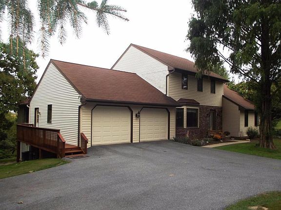 Large property with almost 4000 sq. ft. of living space. Master suite on the main level with upgraded tile walk-in shower, granite double sink and large walk-in closet. Lots of natural light, open kitchen with dining area, dining room and family room with fireplace and deck. Possible in-law quarters on the main level with bedroom, bath, sitting room and private deck. Large lower level family room with wet bar that walks out to a stampedpatio and a ý bath but plumbed for full bath. Also in lower level is a Large workshop area, workout room and separate office room connected to a 3rd garage. Over 2 acres of partial woods and stream with bridge that backs up to farm land.
