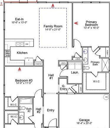 This Durham is a three-bedroom, two-bathroom single story home with an open floor plan. The kitchen has generous solid surface countertop space and an eat-in area that opens to the family room. The primary bedroom is split from the secondary bedrooms and features a large walk-in closet, dual sinks and an over-sized linen closet. Both secondary bedrooms also feature walk-in closets. The laundry room is centrally located and surrounded by even more linen closets. There is a garage entry room where there is plenty of storage in the coat closet and even a nook that could be used as a landing space for all of your items at the end of the day.