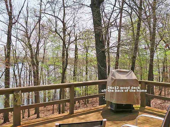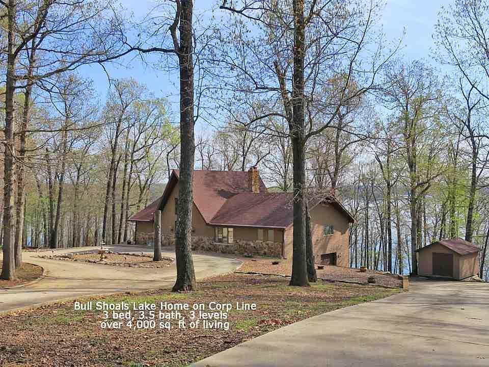 Bull Shoals Lake home in Woodstone Subdivision on Army Corp line w/view of Lake. 3 levels of living, +4400SF, 3 bedrooms, 3.5 baths. Main level 2 story vaulted foyer, living room, natural stone wood burning fireplace. Oak floors, 2 sets glass patio doors to 24 x 12 elevated deck. Cooks kitchen w/stone counters, custom wood cab's, stainless appliances, electric cooktop on island, bow window for lake views. Formal dining room, Master bedroom & bedroom #3 have big windows w/ lake views. Bath has 2 sinks, shower & private soaker clawfoot tub. Utility room on main. 2nd floor bedroom #2 Jr. as a suite w/private bath and Juliette balcony. Poured concrete, walk out LL has family room, office space, full wet bar, wood burning fireplace, safe room, gun room, attached screened patio, 2 car garage, w/storage and workshop area. Hardiboard siding, new roof 2017, Garden shed, concrete circular drive and seller says "we can get to the water's edge!" Near to Browns Beach & Bulls Shoals Marina.