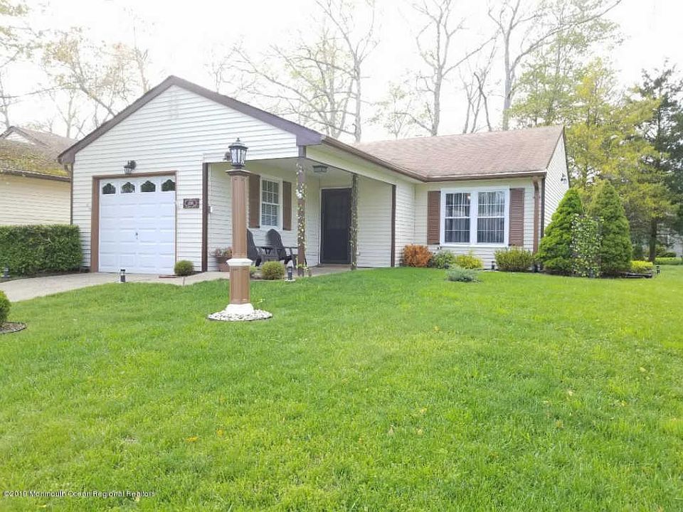 A Spotless home in a charming 55+ Adult Community. Move in Ready. Many upgrades and beautiful landscape,for year round enjoyment or summer get away. Relaxing living room, large eat in kitchen with sliders to open porch and yard. Love the tranquility. 2 nice size bedrooms. Laundry area. 1 car garage. Wonderful club house with gym, activities, and in-ground pool. Very open and well cared for clubhouse and outdoor activity areas. Low fees $70 per month and taxes $2,446. One time joining fee of $150. Because it is a trustee sale it is AS IS with the co and all inspections are the responsibility of the buyer. may need a new roof soon.